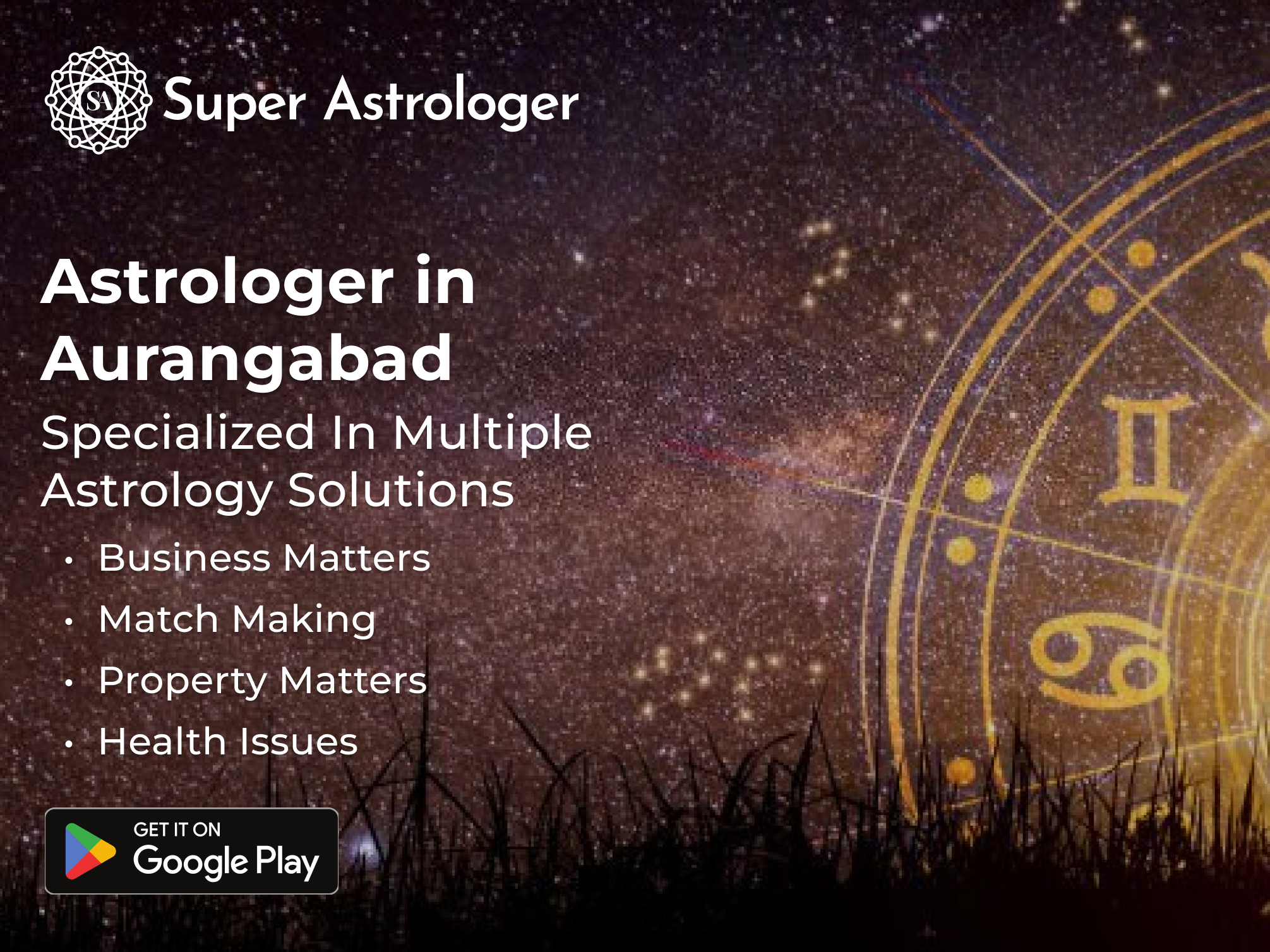 Unlock the door to a profound journey of self-exploration with our exceptionally skilled astrologers in Aurangabad. Super Astrologer stands as your guiding light, where our seasoned experts unravel the mysteries of the celestial language, providing you with profound revelations that will steer the course of your life. Our comprehensive astrology services extend their powerful influence over various aspects of your existence, whether it's nurturing relationships, propelling your career to new heights, or igniting the flames of love. Embrace the transformative potential of our services today. Unlock the transformative power of the universe by connecting with a seasoned Jyotish in Aurangabad. Let the timeless wisdom of the cosmos shape your journey and empower your life. Don't miss out on the opportunity for a premium online astrologer consultation in Aurangabad – seize it now by downloading the Super Astrologer app today!