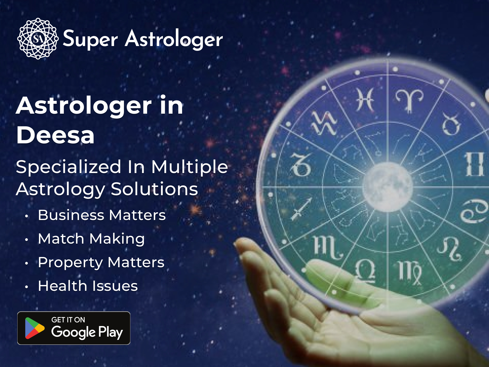 Download the Super Astrologer app from the play store for free, then signup with your mobile number and create your profile. After setup, you’ll get access to talk with expert astrologers in Deesa through, the astrologer's contact number.