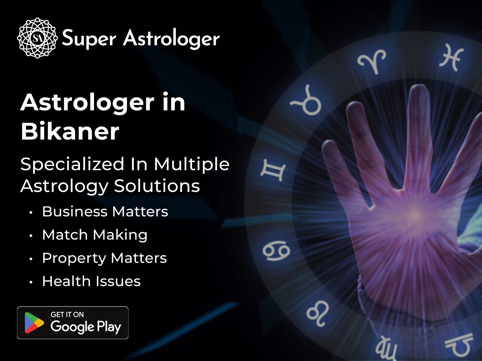 Super Astrologer offers profound insights through celestial alignments, guiding you to make informed life choices. Our experienced Jyotish in Bikaner specializes in relationships, careers, and love solutions. Connect with us to unlock the power of cosmic guidance and enhance your life's path. Experience the profound impact of astrology on your journey. For a top-notch online astrologer consultation in Bikaner, download the Super Astrologer app now and enrich your life's voyage.