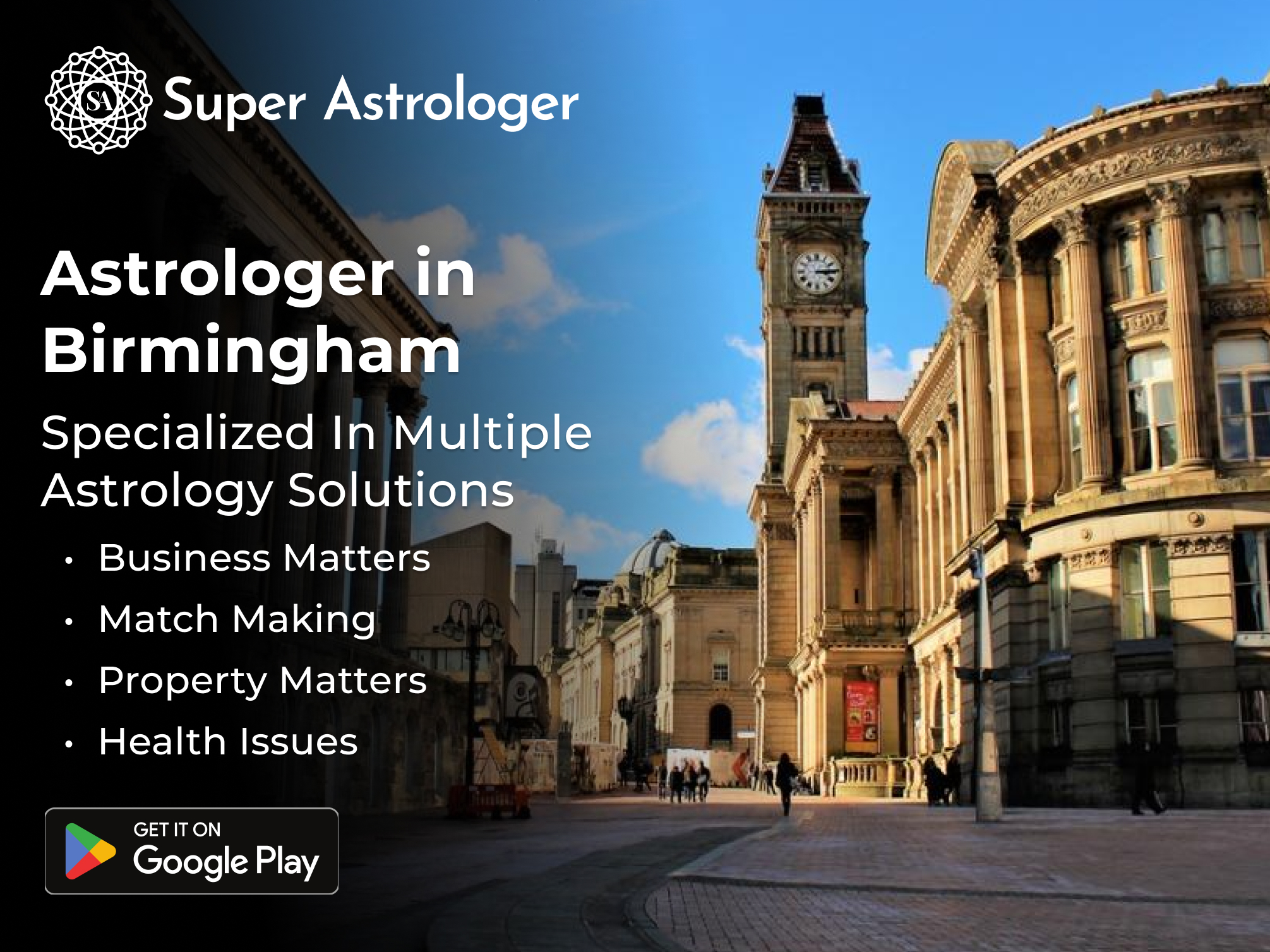 SuperAstrologer serves as your ultimate destination for astrology services on the internet in Birmingham. We possess the best astrologer in Birmingham City, who possesses the capability to assist you with any issues or inquiries you may have. Whether you desire to gain insight into your future, enhance your relationships, boost your career, or accomplish your goals, SuperAstrologer can provide you with guidance utilizing the profound wisdom of the celestial bodies. Our online astrology services are simple, convenient, and reasonably priced. You are able to select from a variety of options, such as phone, chat, video, or email consultations. SuperAstrologer stands as the best astrologer in Birmingham, equipped to enhance your life through the application of astrology.