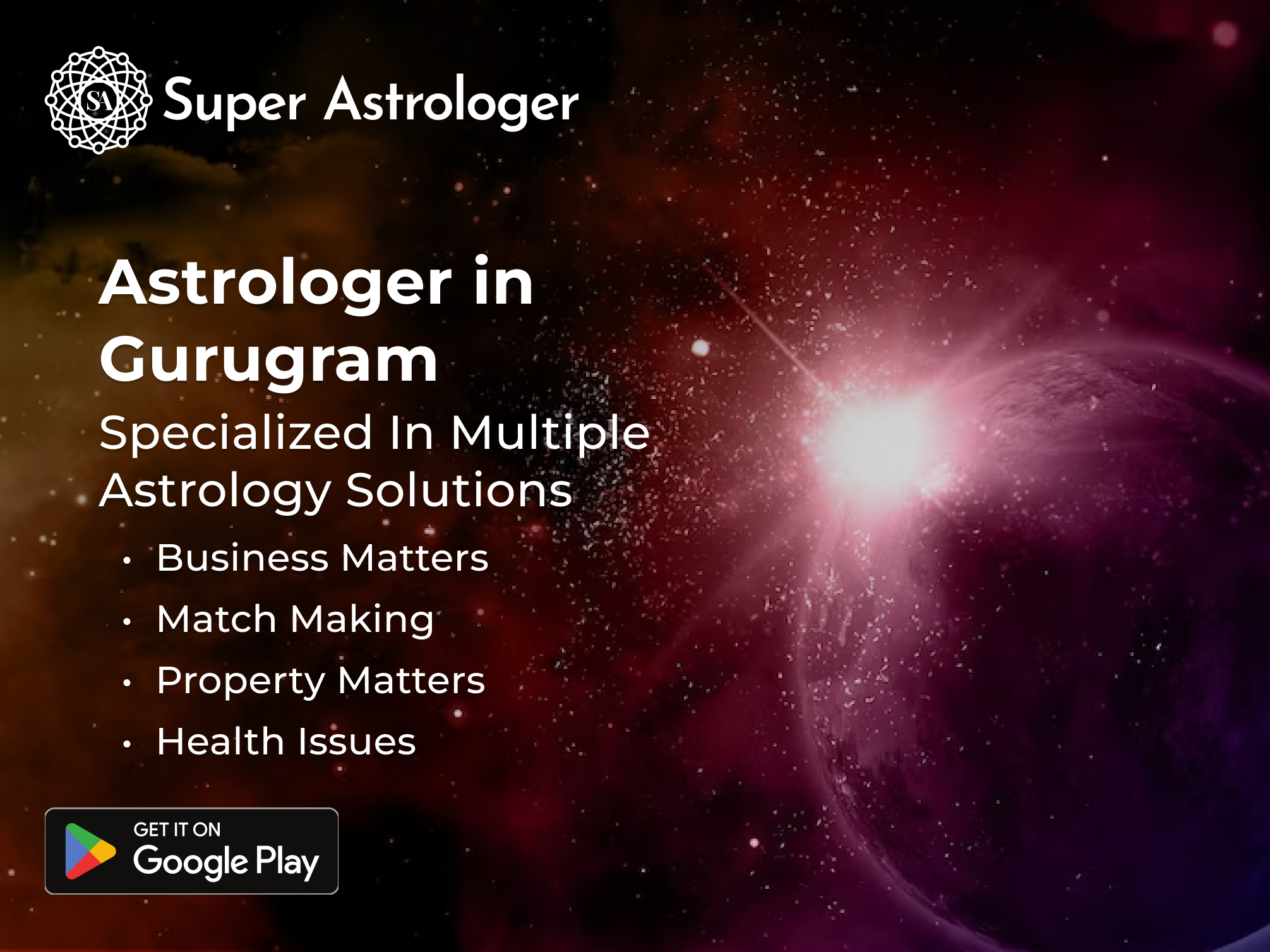 Discover the guidance you seek with our famous astrologer in Gurugram. Unlock the mysteries of your life, relationships, and future with accurate predictions and valuable insights. Our experienced and knowledgeable astrologers offer personalized consultations, delving into various aspects of your life and providing remedies for challenges. Whether it's about a career, love problem solution, health, or finance, find clarity and direction through genuine astrology with Super Astrologer.