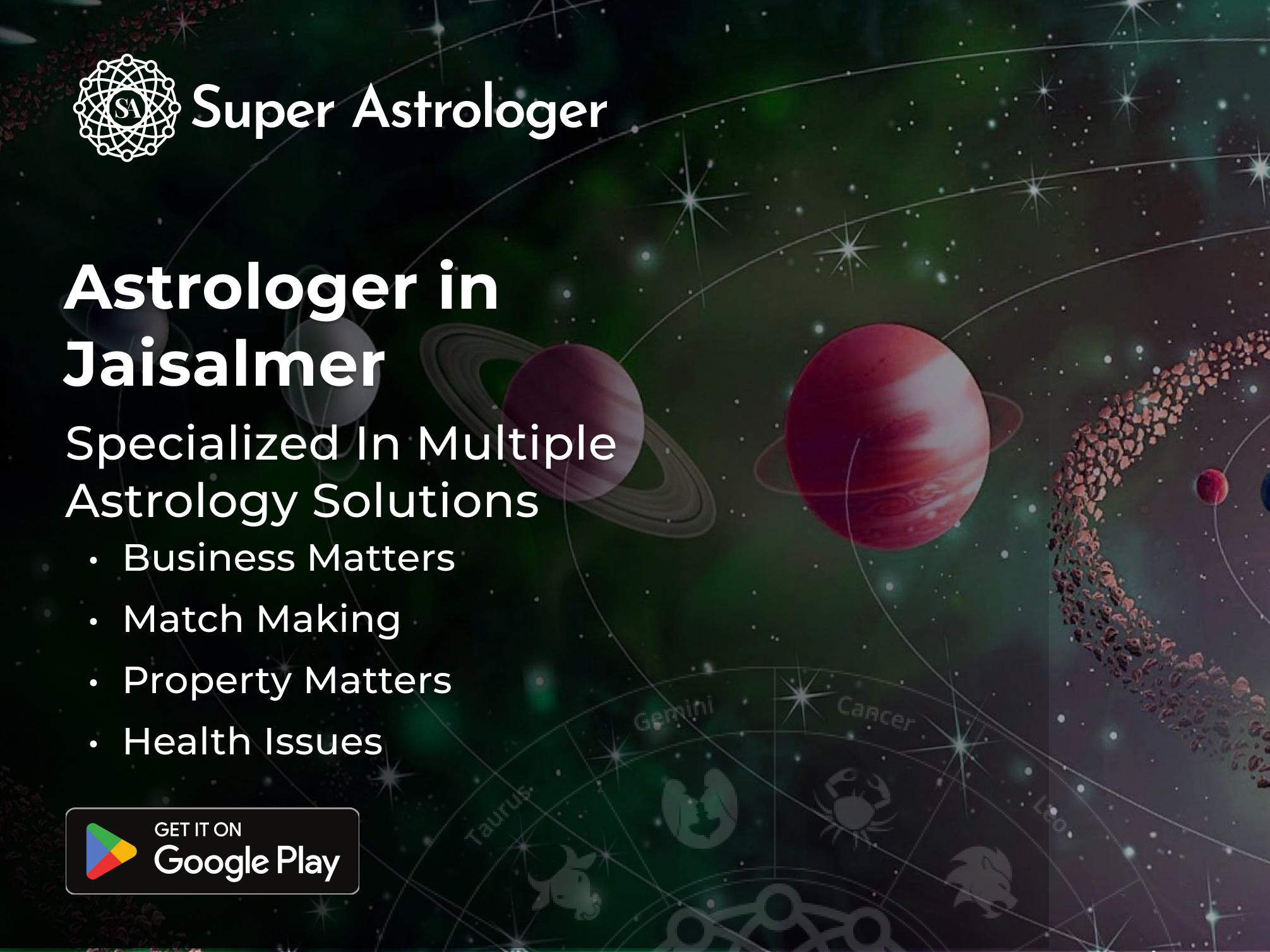 Comprehensive Astrological Services: The Super Astrologer application serves as the definitive platform for all of your astrological necessities. Ranging from comprehensive evaluations of individual birth charts to the provision of daily horoscopes, personalized consultations, and efficacious solutions, our aim is to present a wide array of services uniquely designed to cater to your specific requirements. Opt for Super Astrologer for reasonably priced astrologer fees in Jaisalmer.