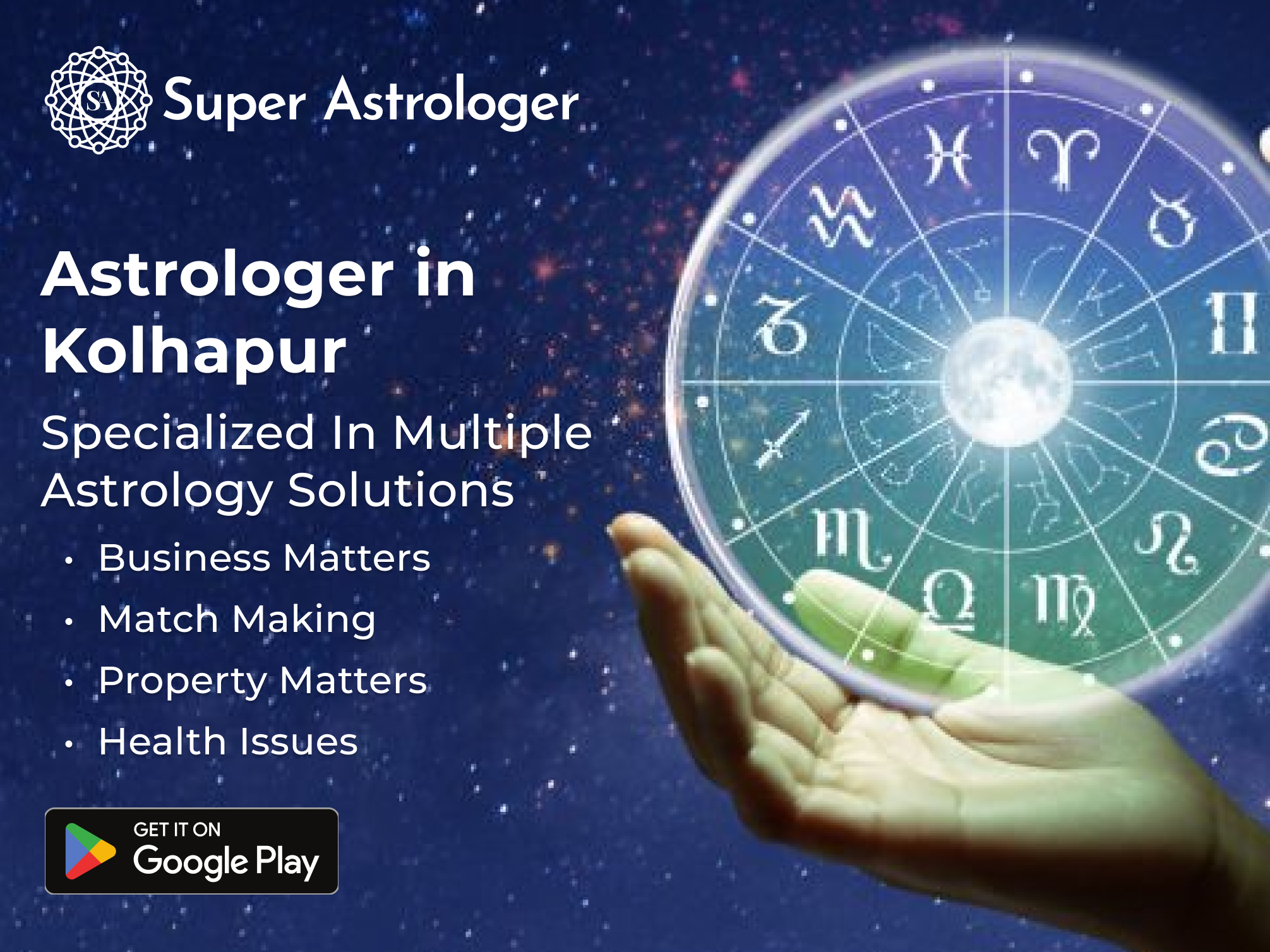 Our team of experienced and knowledgeable astrologers in Kolhapur offers reliable and accurate astrology services. We provide a broad range of services, such as natal chart analysis, horoscope matching, gemstone recommendations, tarot card readings, and more. Our aim is to assist you in gaining a deeper understanding of yourself and your life. We provide personalized guidance to help you navigate the challenges and opportunities that come your way. With our astrology services in Kolhapur, you can unlock the power of astrology and make informed decisions about your future. To learn more about our services and schedule a consultation with our trusted astrologers in Kolhapur, visit our website at www.superastrologer.com. You can also contact us at +91-9369152829 to schedule an astrology consultation today.
