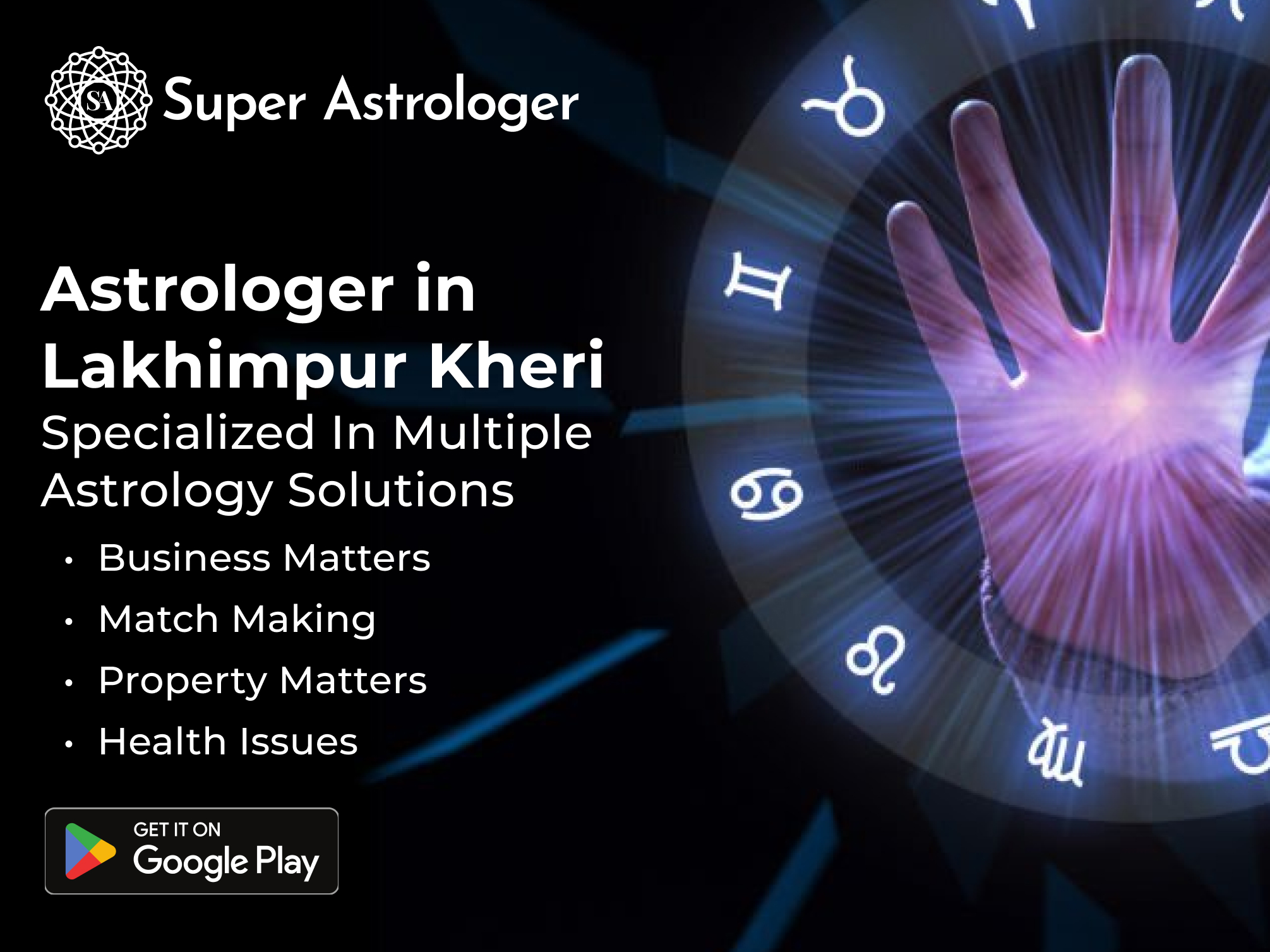 Super Astrologer is the best Astrology app for all Astro services. Super Astrologer app connects you with the most learned and experienced astrologers who are well-versed in various fields of Astrology so you can get accurate and personalised predictions for all your problems. Download our Super Astrologer Mobile App for the best Astro services like Numerology, Gemstones, Birth Charts, Palmistry and so on.
