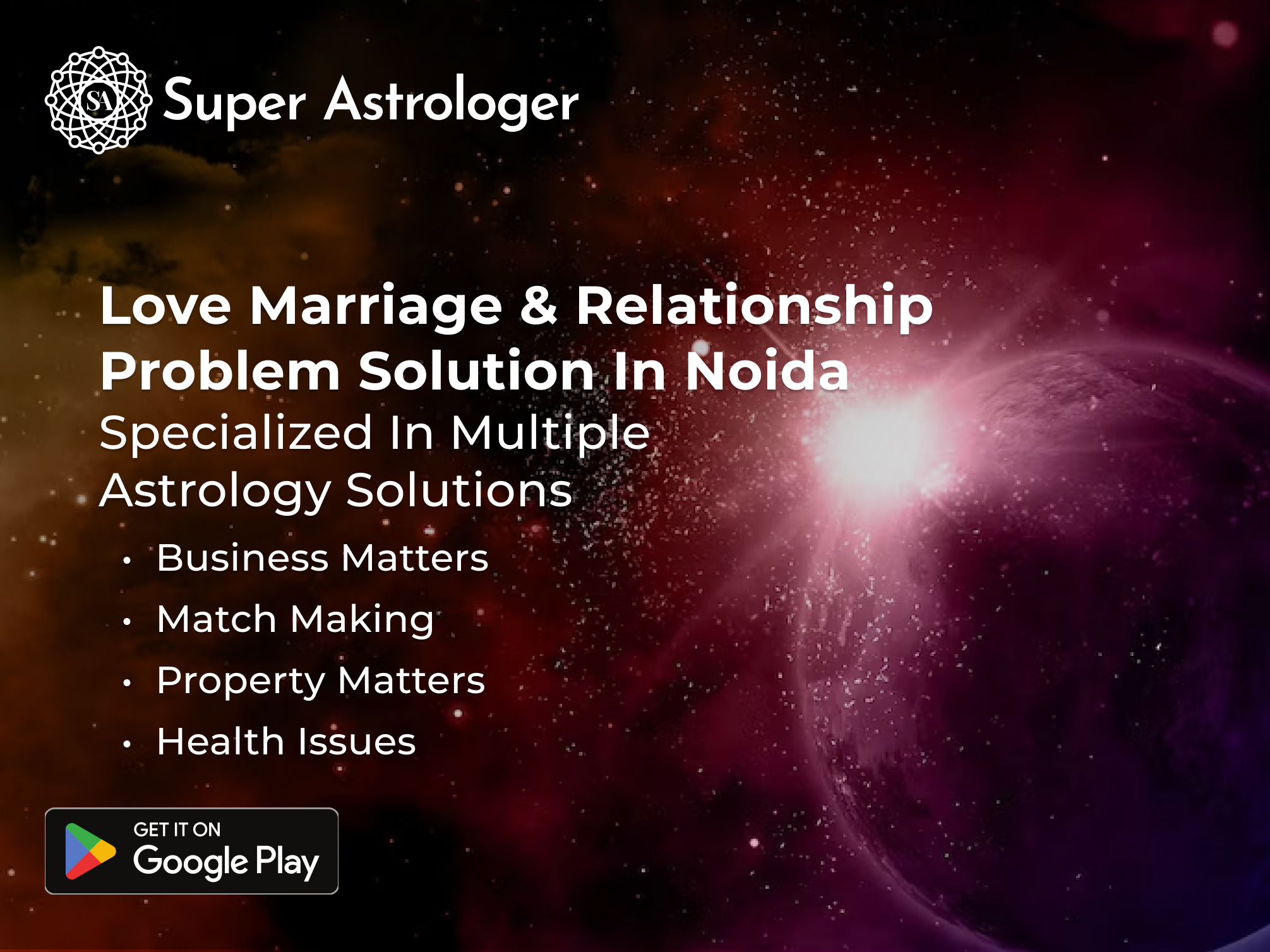 Love Problem Solution In Noida refers to the assistance provided to individuals who are facing issues or challenges in their romantic relationships in the city of Noida, India. This service is offered by a Love Problem Specialist who uses astrological and other spiritual methods to help people overcome their love-related problems. To access this service, you can download the best astrology app - Super Astrologer, which provides easy and convenient access to the Love Problem Specialist in Noida.